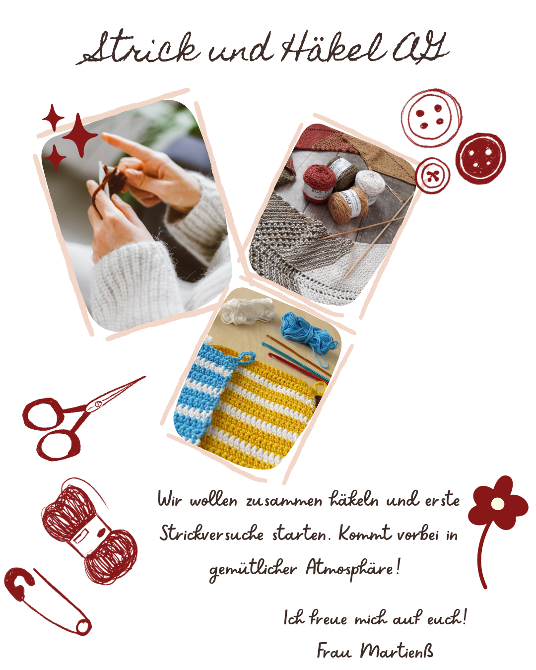 | Mi | 14.05 Uhr - 15.05 Uhr | Häkel- und Strick-AG | M. Martienß | H004 |